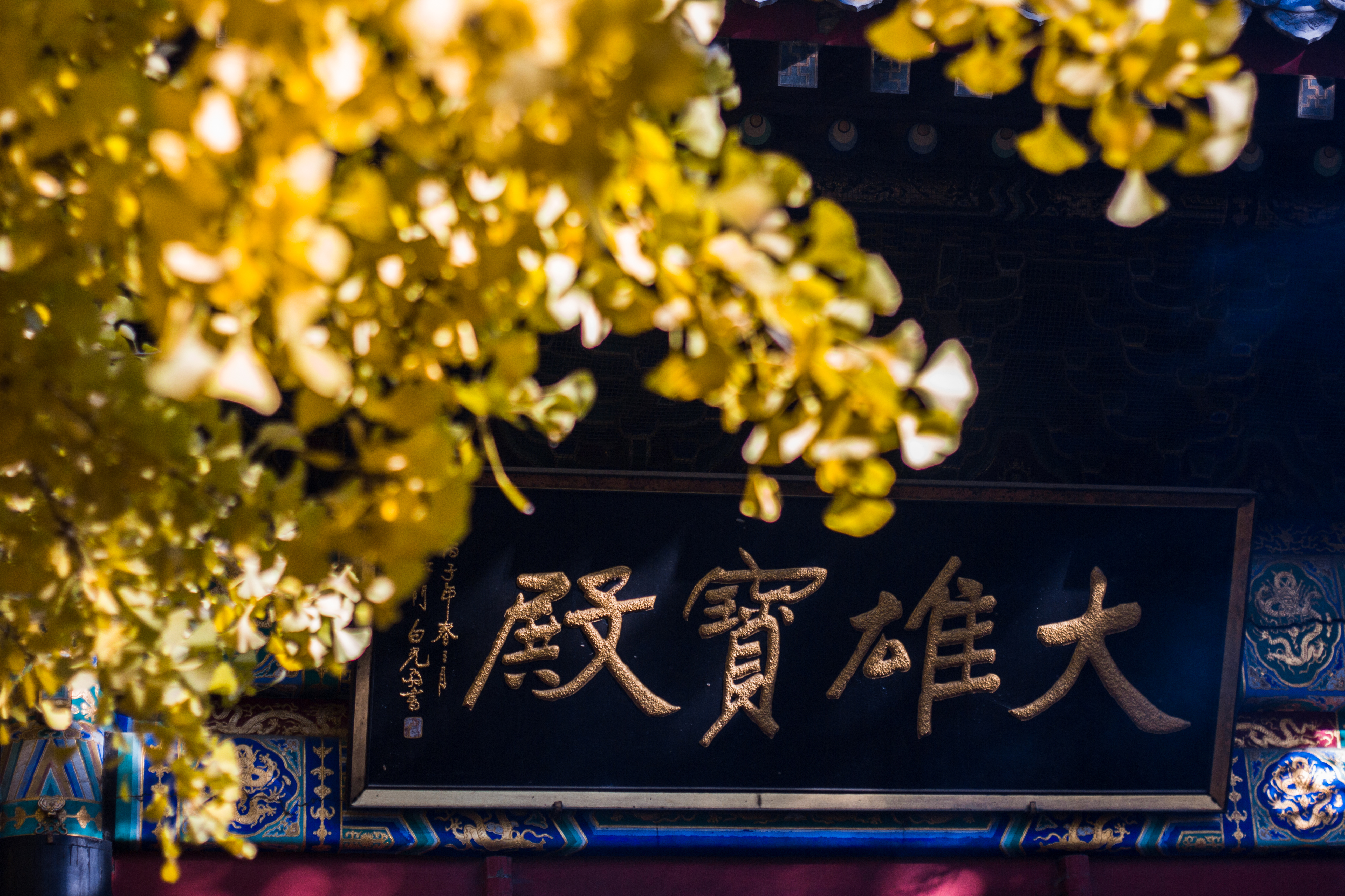 At the beginning of November, the photo is taken close to the 8h30 am which is almost the only moment of the day that the sunlight can light the gilded plaque through the occlusion of the architectures and surrounded trees of the temple.